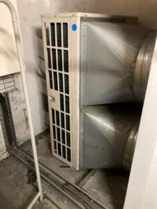 Par ailleurs, le local technique où sont positionnées les unités extérieures de climatisation est le même que celui où se trouvent les groupes de production de froid pour les chambres froides. Cette production de froid rejette donc l'air chaud à proximité de l'endroit où l'air est repris pour les unités de climatisation. En conséquence, la température de reprise d'air est ici très élevée, surtout lors des pics de chaleur, quand les groupes froid et de climatisation tournent à plein régime. La température de fonctionnement des unités extérieures peut facilement être de cinq degrés supérieure à la température ambiante extérieure."