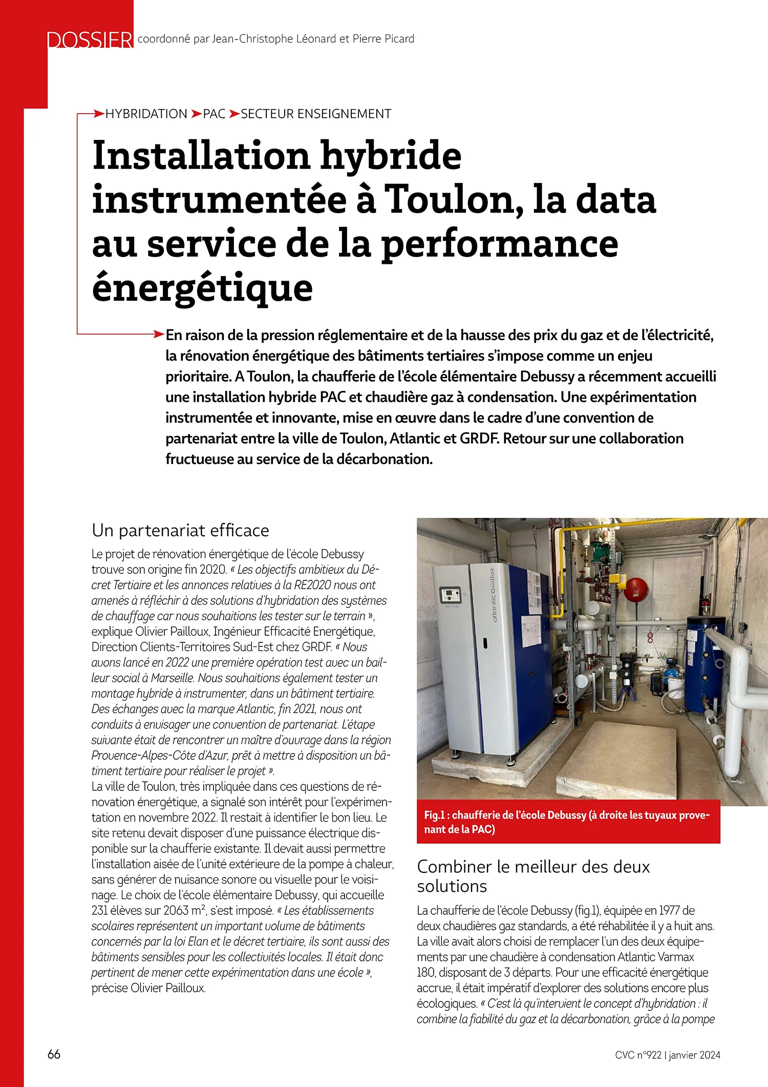 A Toulon, la chaufferie de l’école élémentaire Debussy a récemment accueilli une installation hybride PAC et chaudière gaz à condensation. Une expérimentation instrumentée et innovante, mise en œuvre dans le cadre d’une convention de partenariat entre la ville de Toulon, Atlantic Systèmes et GRDF. Retour sur une collaboration fructueuse au service de la décarbonation