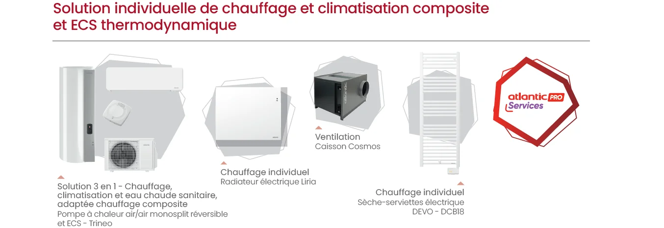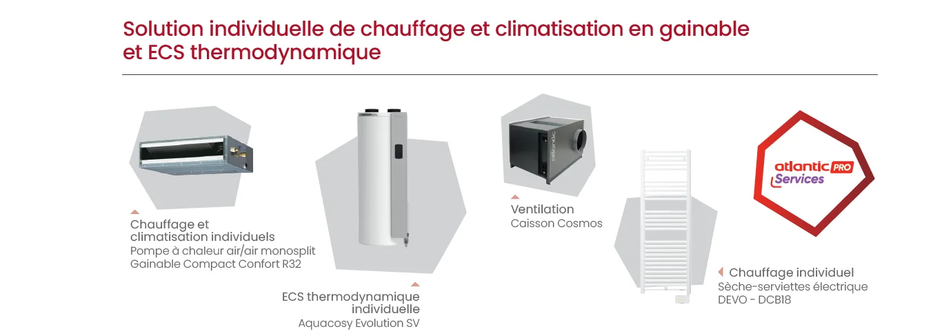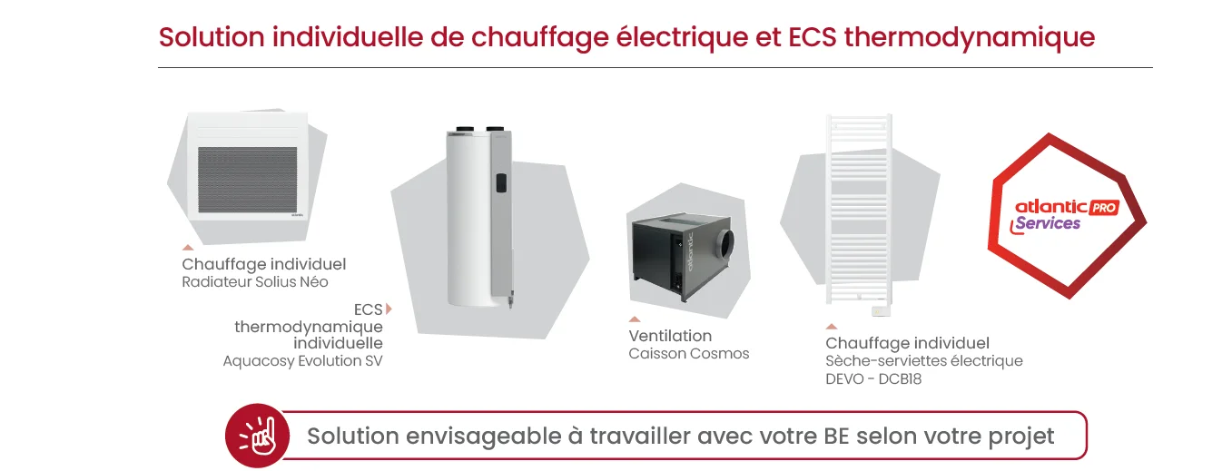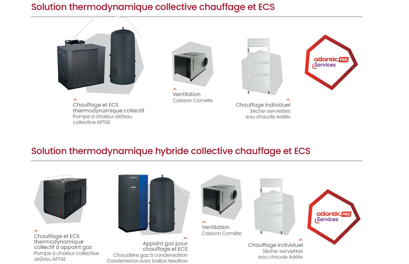 Avec Atlantic, vous pouvez choisir des solutions de chauffage et d'ECS individuelles ou collectives; selon vos besoins, vos projets, mixer les solutions permet de s'adapter à vos contraintes et aux exigences de la RE2020.